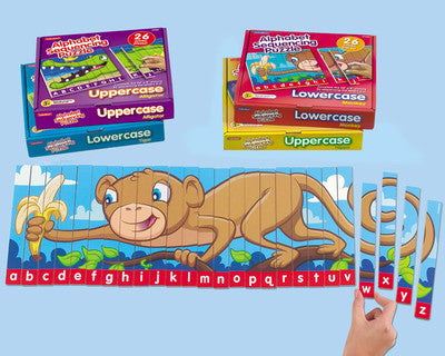 Nuestros rompecabezas de 20 x 66 cm cuentan con 26 piezas cada uno, una por cada letra del alfabeto. Los estudiantes simplemente ponen las piezas en orden alfabético para revelar un simpático animal, y reciben una interesante introducción a la identificación y secuenciación de letras a medida que avanzan. El juego completo incluye 4 rompecabezas autocorrectivos. El set incluye dos puzzles con letras mayúsculas (el cocodrilo y el hipopótamo) y dos puzzles con minúsculas (el mono y el tigre).