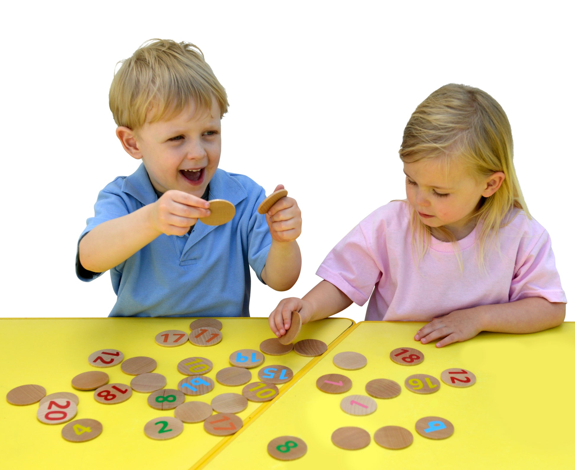 Set de 40 discos de madera decorados con números del 1 al 20. Por un lado son blancos, para poder voltear los discos y descubrir los pares. Incluye una bolsa de tela para guardar las piezas. Los discos miden 5 cms. de diámetro. Los discos también pueden utilizarse para practicar el conteo de 1- 20 e identificar números.